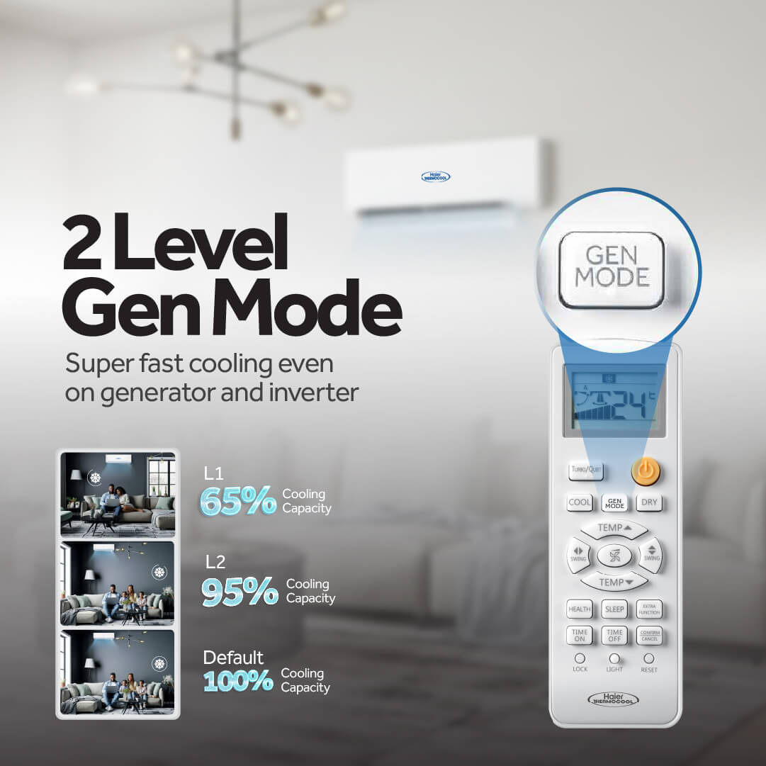 Haier Thermocool is making life comfortable with our innovative range of GenPAL Inverter Air Conditioners, which are designed to Save upto 70% energy consumption with 47% faster and better cooling. Thus, user can Power multiple GENPAL Airconditioners at once, while still saves on Electricity consumption and Generator size requirement.